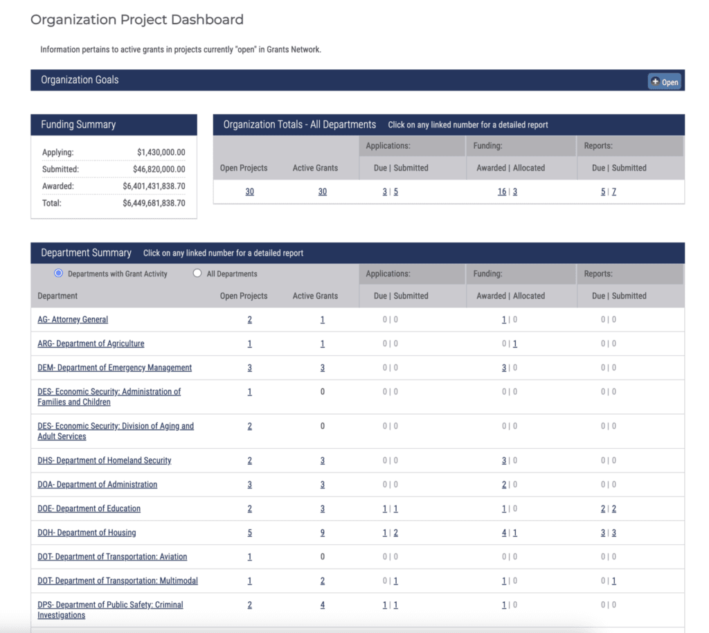 Staff can manage requirements and deliverables for all relevant grants while also tracking performance compared to pre-determined objectives and goals.